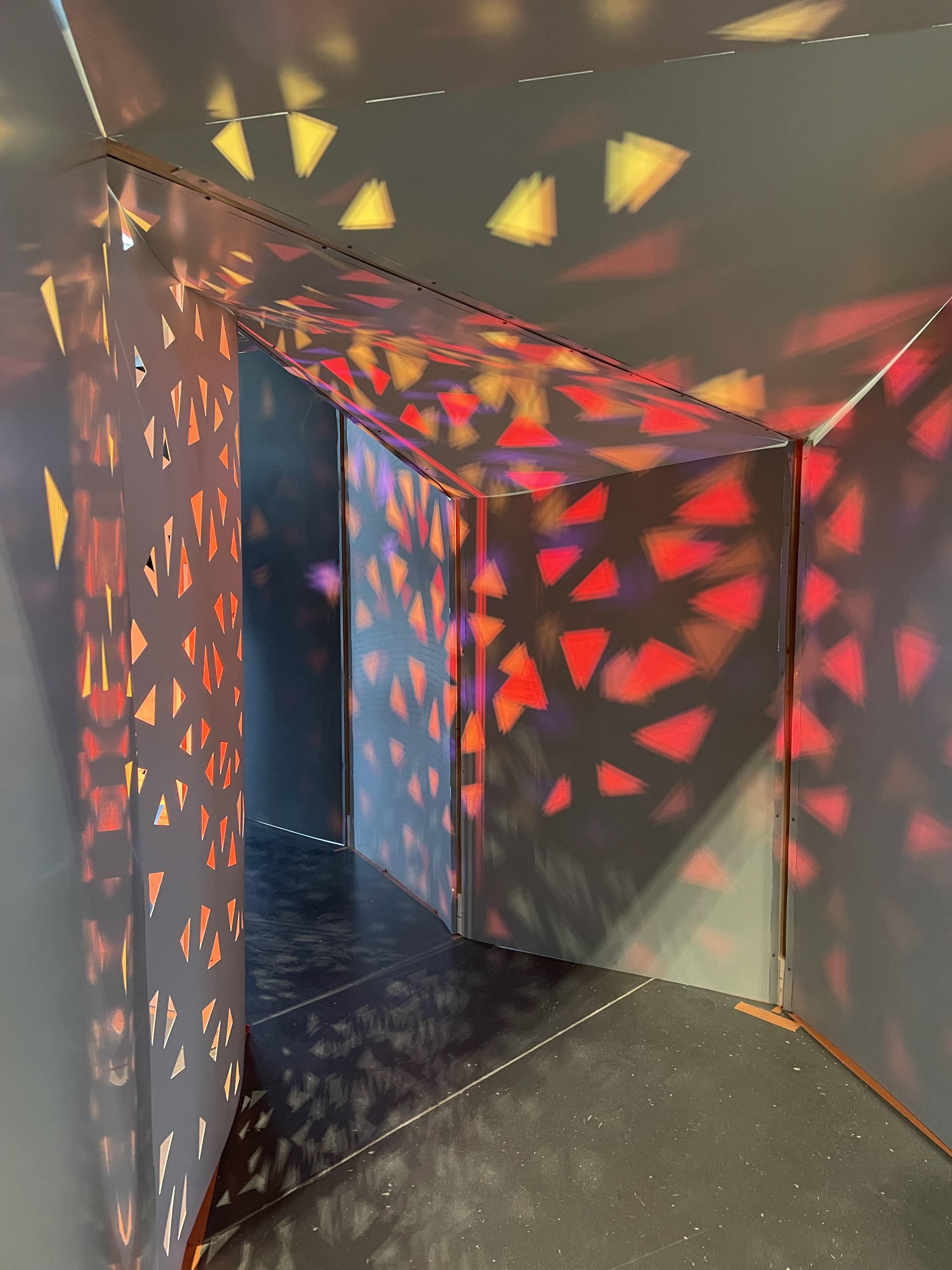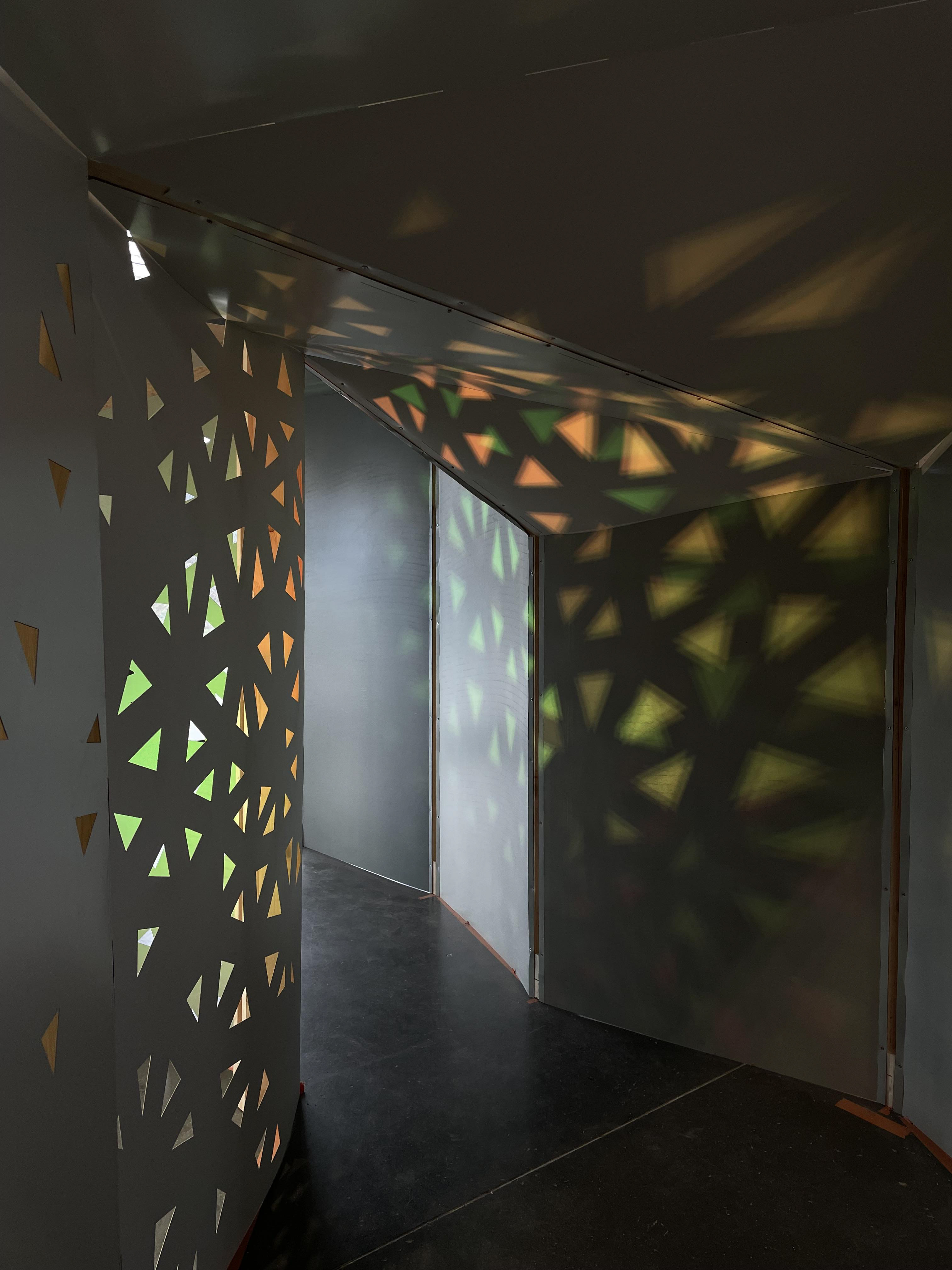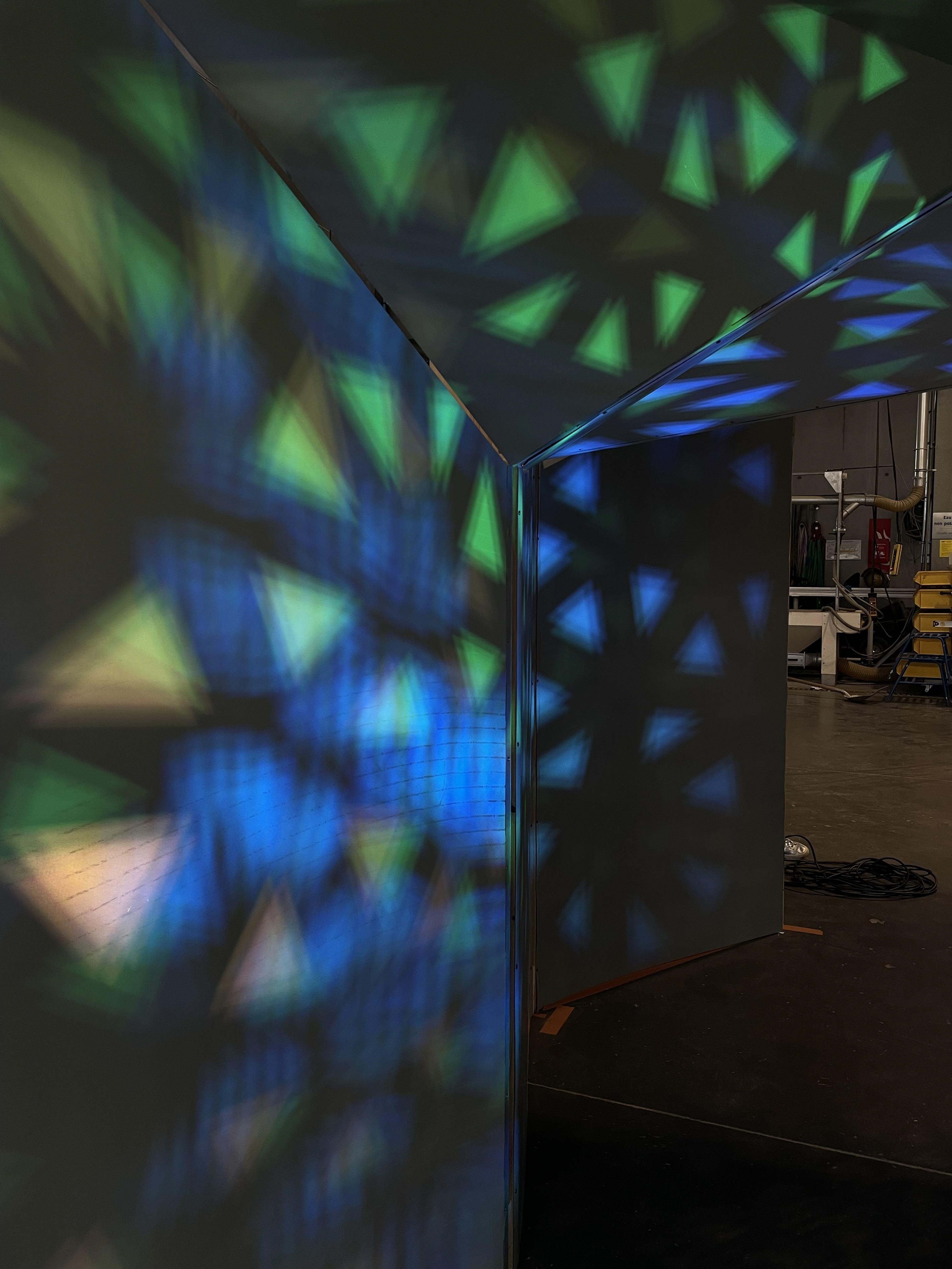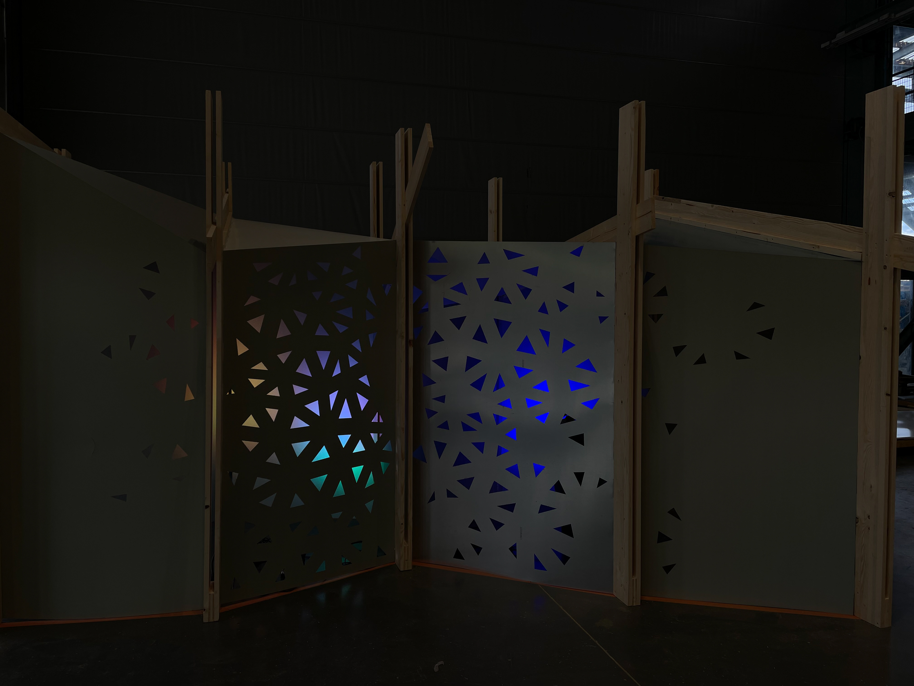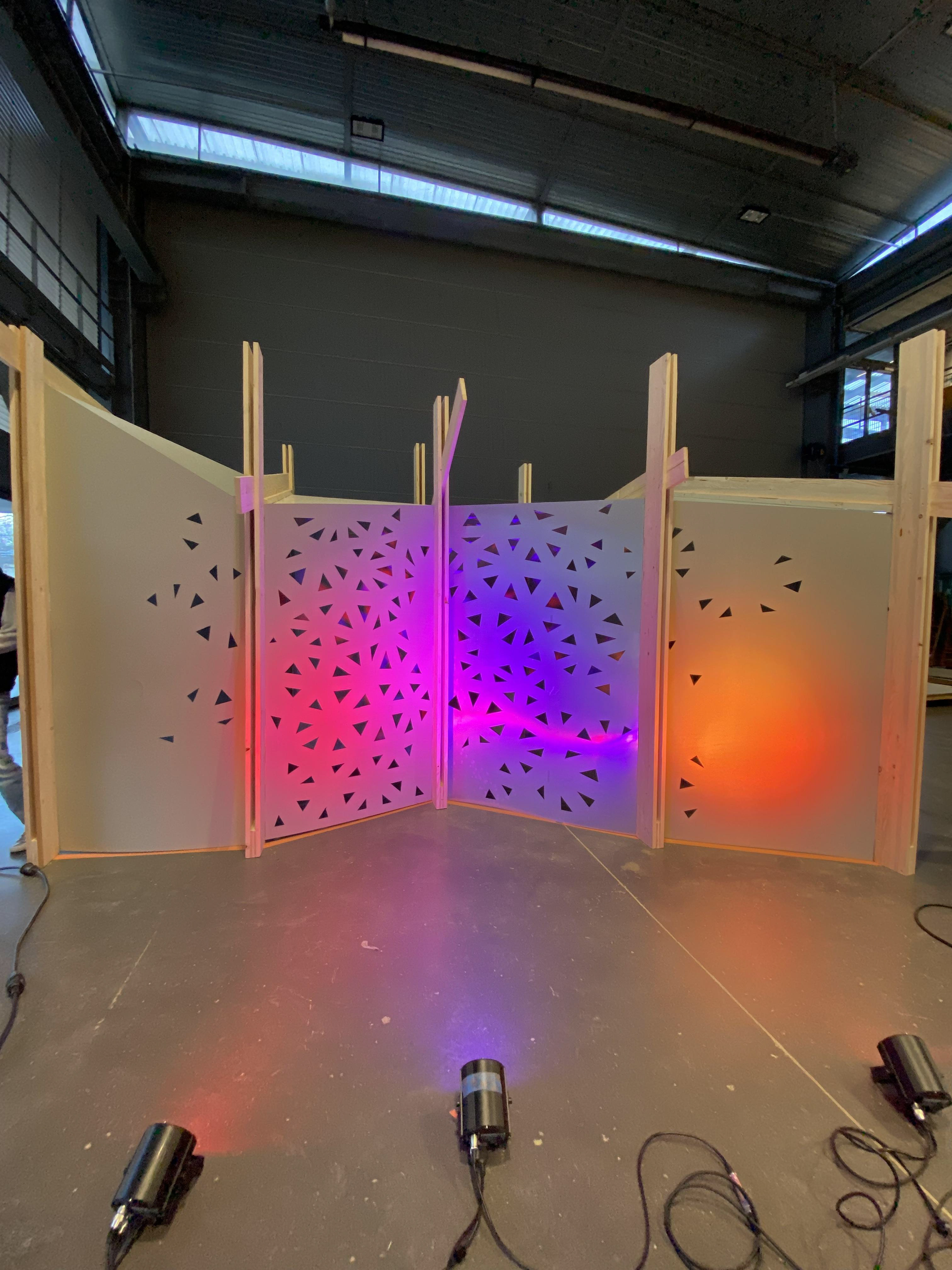 Second travail sur la réalisation à taille réelle de la structure. L’objectif : apprendre à utiliser les machines (la découpeuse jet d'eau), découvrir les matériaux (tôle acier, bois) et leurs utilisations. Travail de scénographie réalisé à l’aide d’éclairages pour apprendre à mettre et pratique et en valeur le pattern conceptualisé.